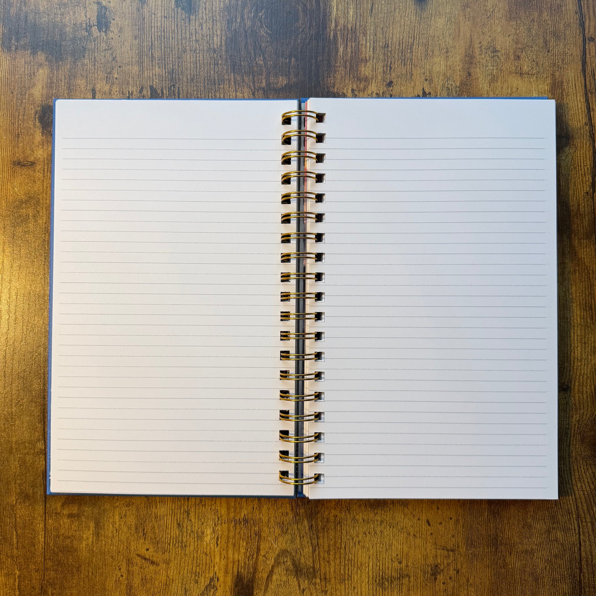 Hardcover notebook with at least 100 new lined pages separated by pages from the original book. Front inside cover has a paper pocket with a library-style card to customize your notebook or leave a personalized note if giving as a gift. Spiral bound with a simple and sturdy wire gold spiral binding.